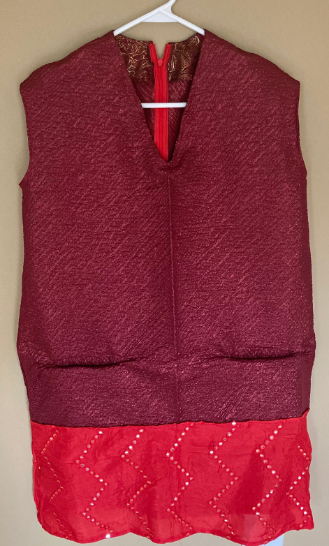 Embrace modern elegance intertwined with traditional Gujarati flair with The Dia Cape Romper. This sleeveless, cape sleeve romper features an invisible zipper closure for a seamless fit, crafted from luxurious Pink abhla mirror embroidered fabric, enriched with maroon brocade, and adorned with exquisite pink silk embellishments. Perfect for the fashion-forward woman who honors tradition, this piece stands as a symbol of sophistication and heritage. Elevate your wardrobe with a statement of vibrant elegance and unique craftsmanship.