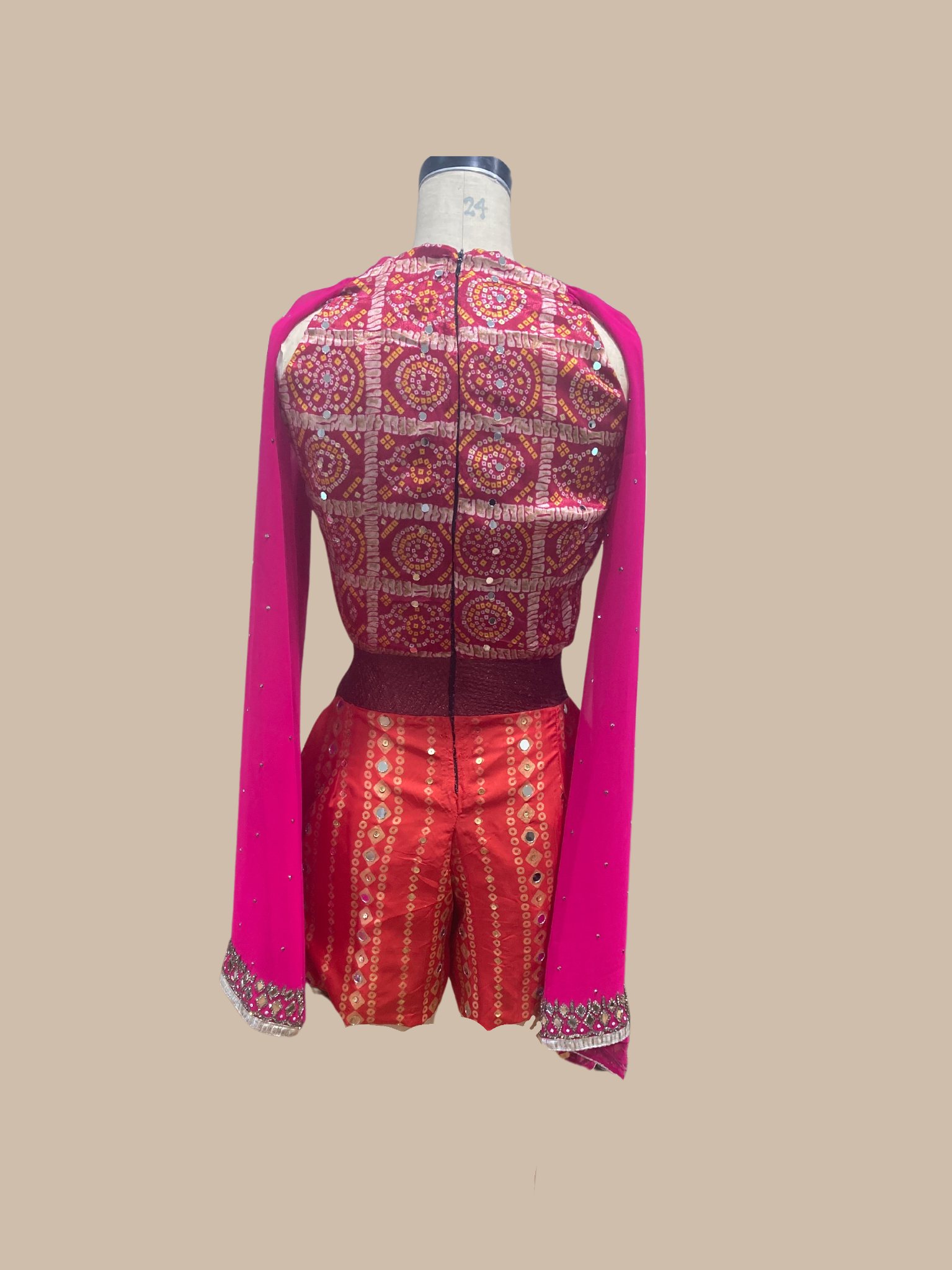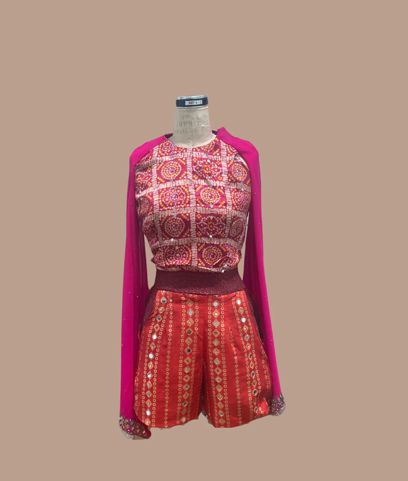 Embrace modern elegance intertwined with traditional Gujarati flair with The Dia Cape Romper. This sleeveless, cape sleeve romper features an invisible zipper closure for a seamless fit, crafted from luxurious Pink abhla mirror embroidered fabric, enriched with maroon brocade, and adorned with exquisite pink silk embellishments. Perfect for the fashion-forward woman who honors tradition, this piece stands as a symbol of sophistication and heritage. Elevate your wardrobe with a statement of vibrant elegance and unique craftsmanship.