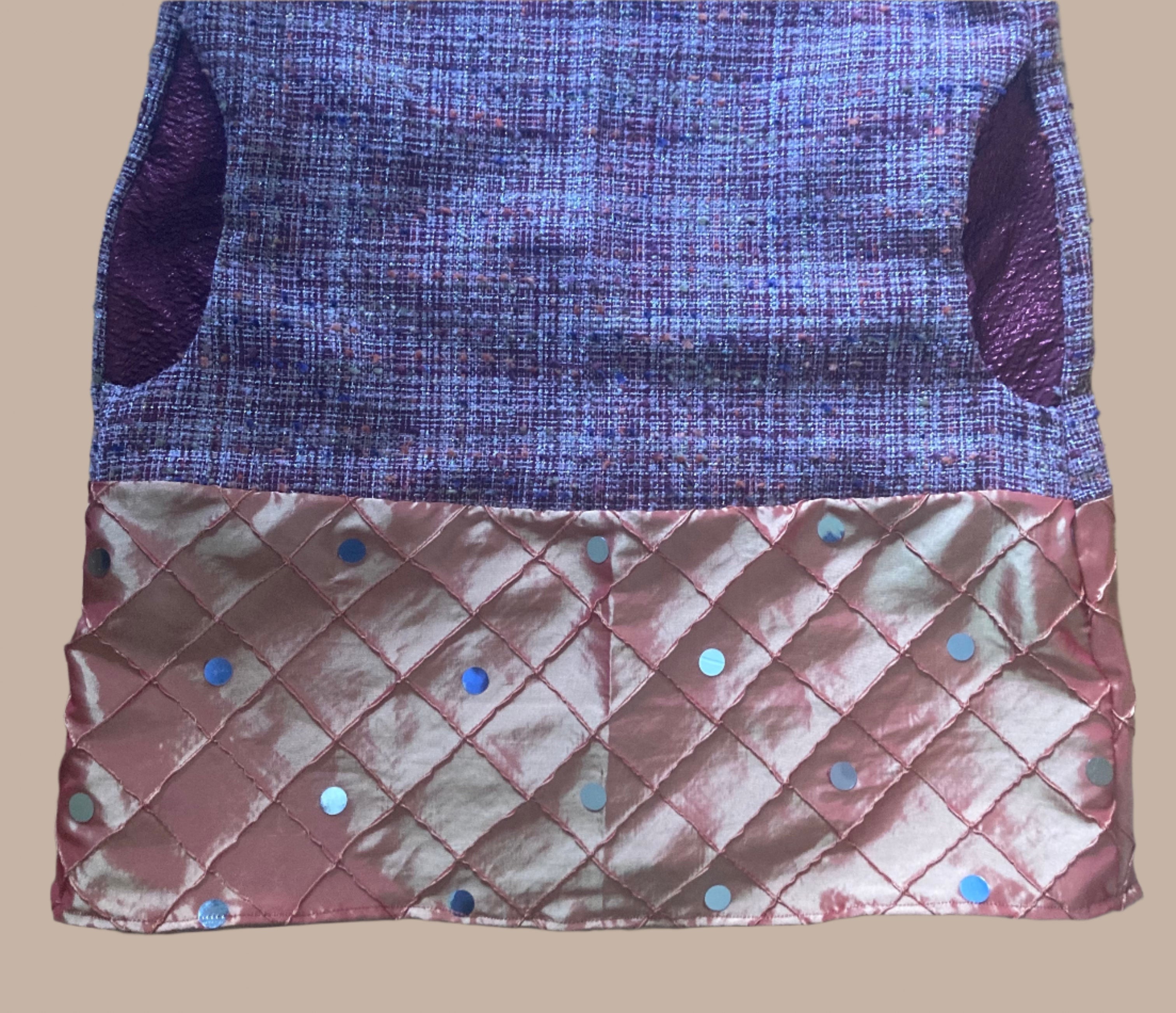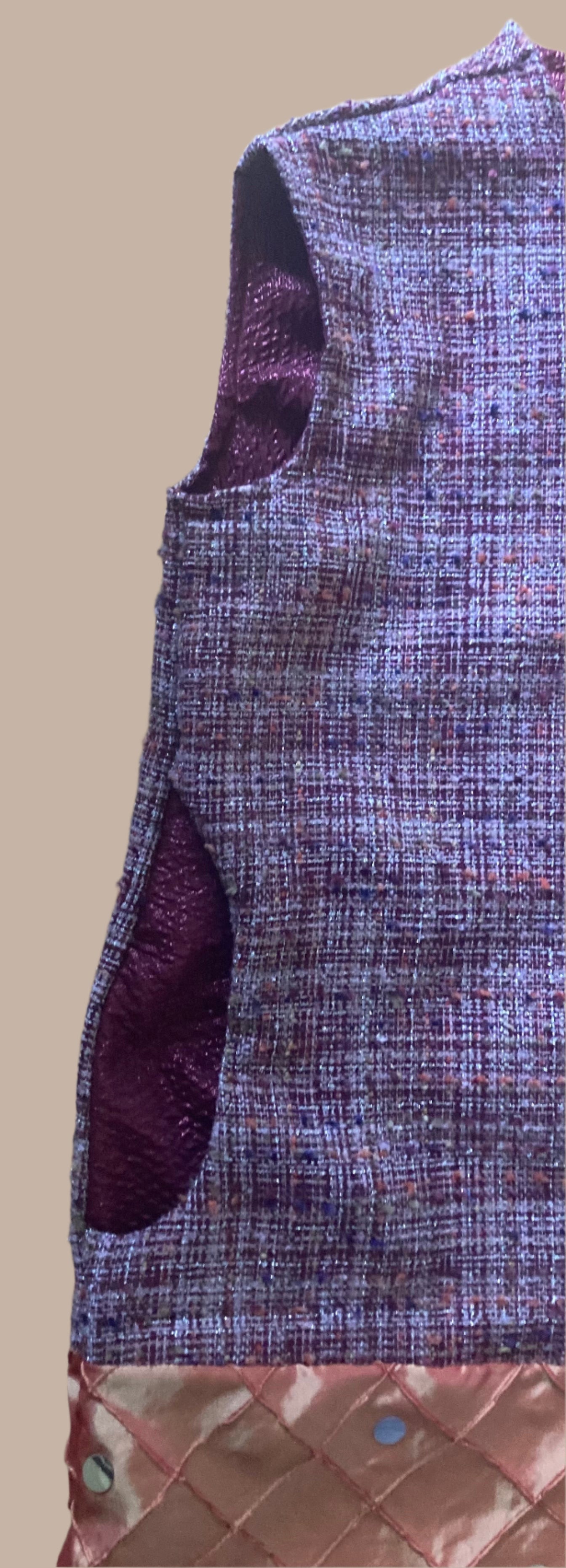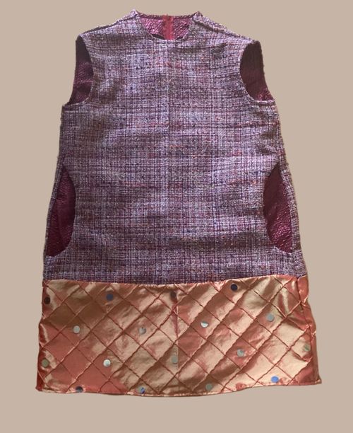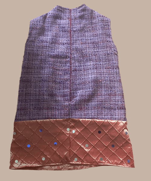 Experience the fusion of tradition and modern elegance with The Geo Shift Dress. This mock-neck shift dress with pockets and an invisible zipper is crafted from multi-colored tweed and accented with hand-embroidered pin-tuck satin. Perfect for the modern woman, it adds Gujarati flair to your wardrobe. Embrace sophistication and functionality in one beautiful piece.