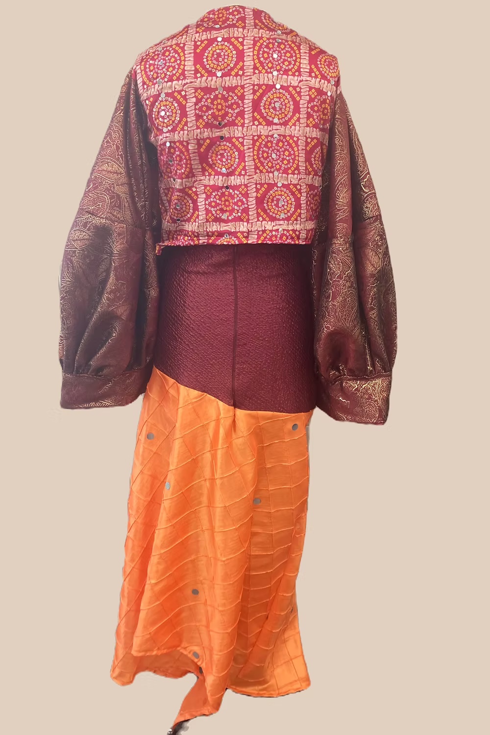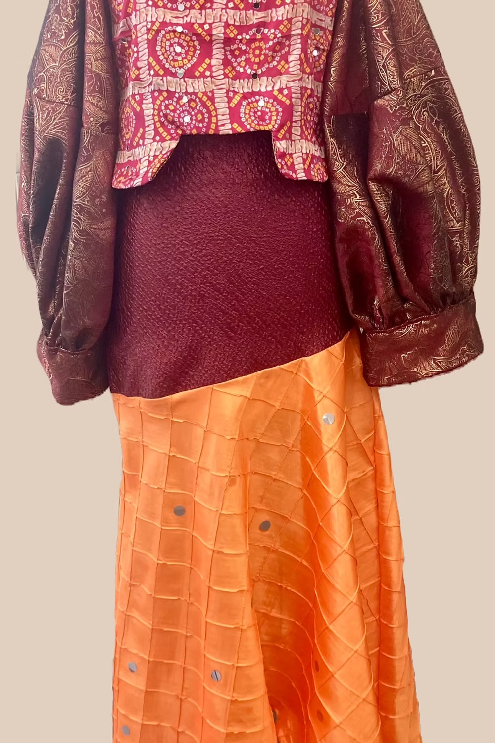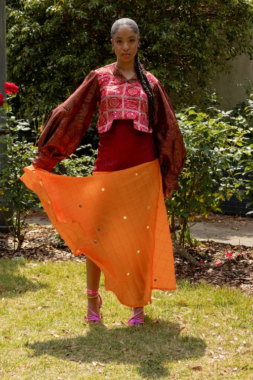 Step into a world where tradition meets modern elegance with The Iyra Maxi Skirt. This exquisite asymmetric hem maxi skirt features a luxurious maroon brocade panel and delicate hand-embroidered abhla details, perfect for any sophisticated occasion. Designed with an invisible zipper in the back for seamless closure, this skirt ensures both comfort and style. Its lightweight construction makes it effortless to wear, embodying the perfect balance of Gujarati flair and contemporary charm.