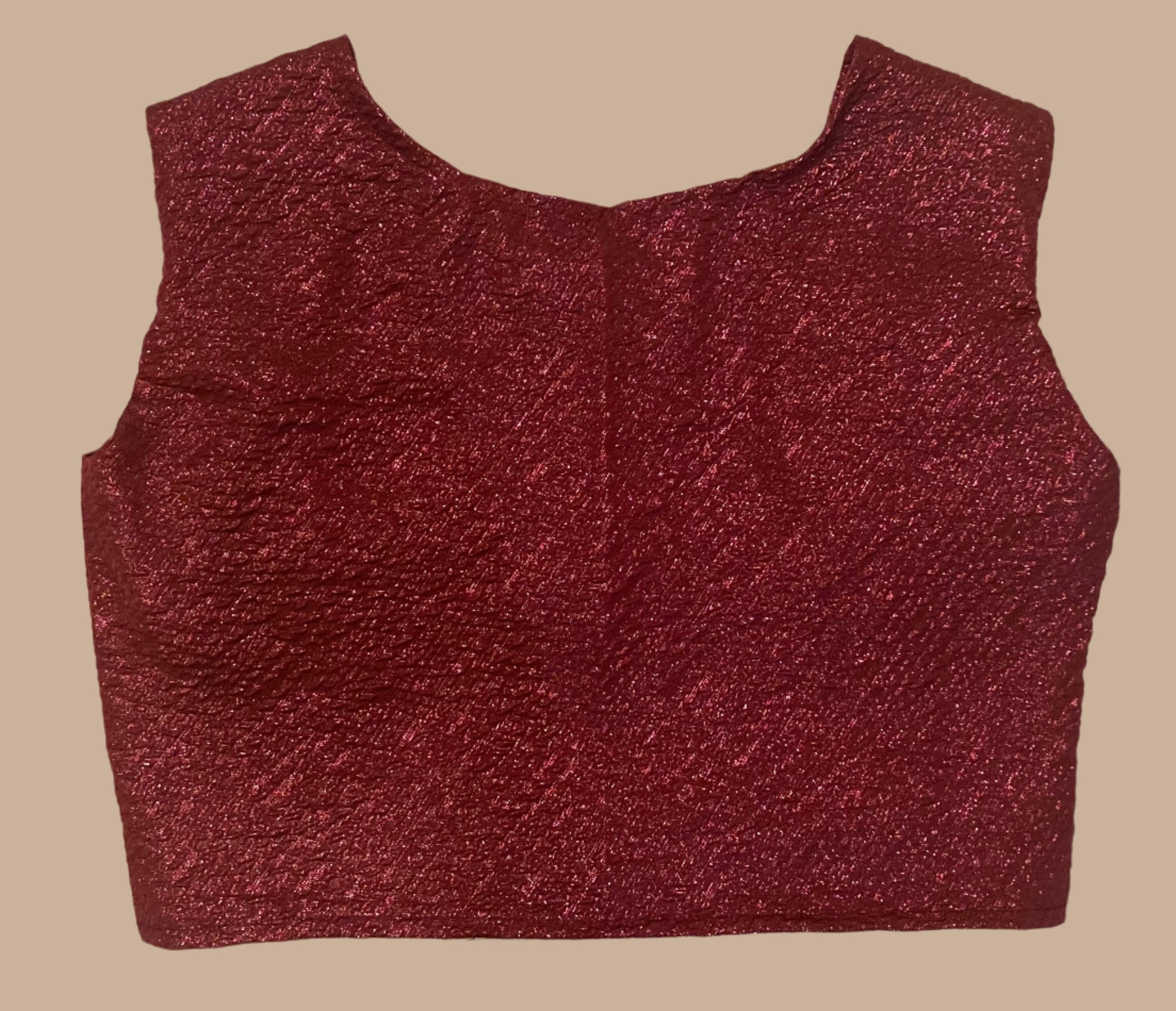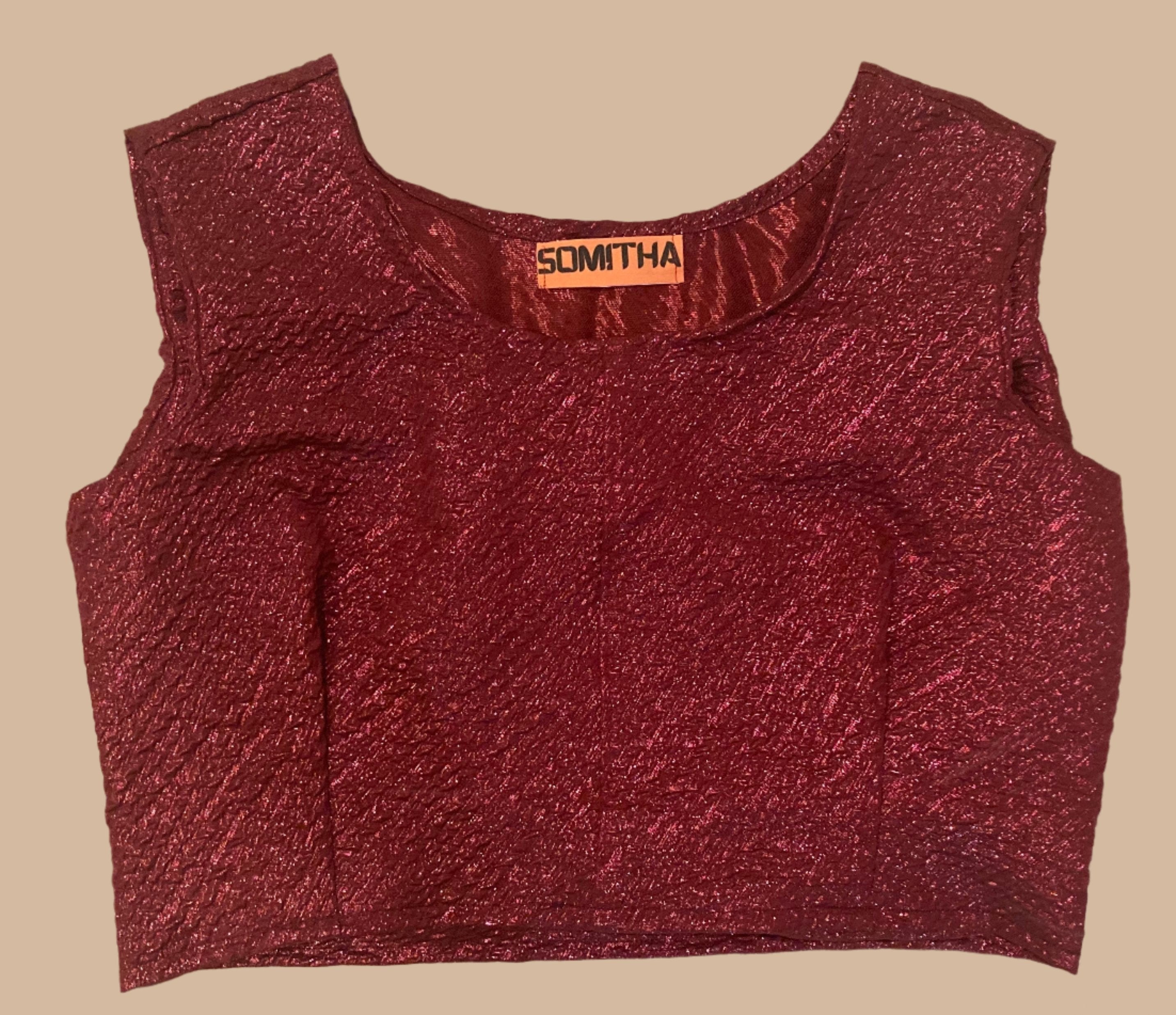 Discover timeless elegance with The Tri Blouse at Somitha. This cropped, maroon brocade blouse with wide straps and a round neck mixes traditional craftsmanship with modern design. Ideal for festive or casual events, its rich texture and flattering cut will make you stand out easily.